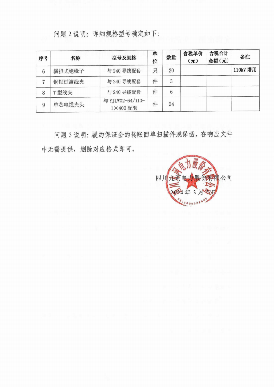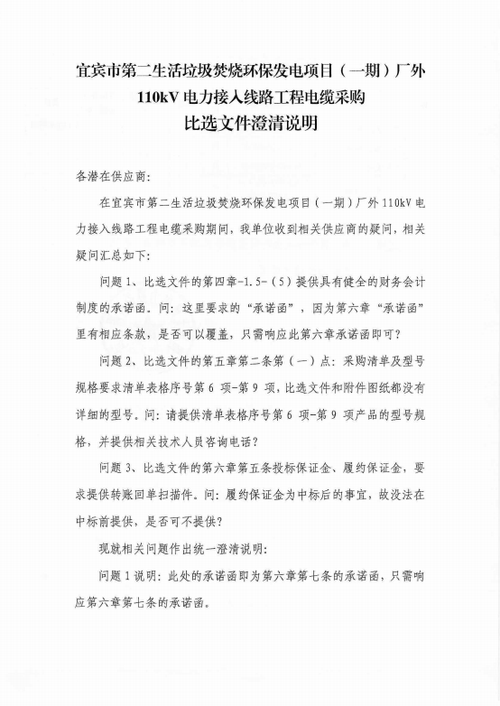 宜宾市第二生活垃圾焚烧环保发电项目(一期)厂外110kV电力接入线路工程电缆采购比选文件澄清说明