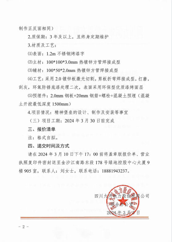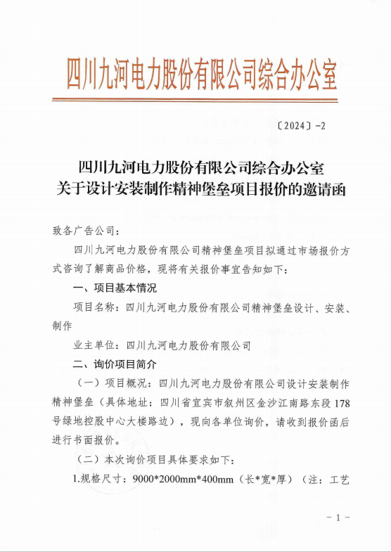 四川九河电力股份有限公司关于办公用品采购供应商的邀请函(第二次)