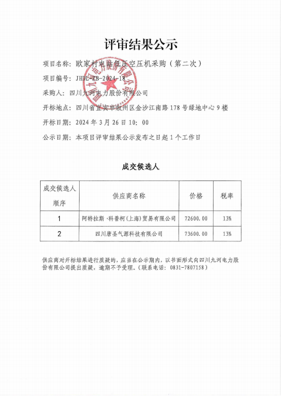 欧家村电站低压空压机采购(第二次)评审结果公示