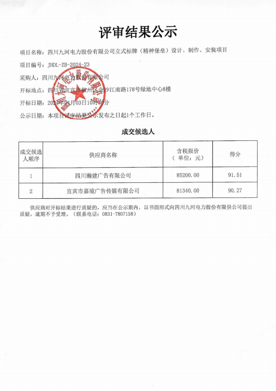 四川九河电力股份有限公司立式标牌(精神堡垒)设计、制作、安装项目评审结果公示