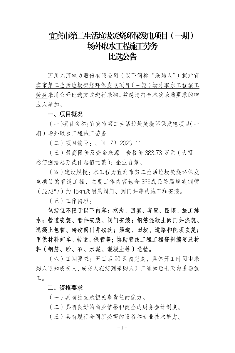 四川九河电力股份有限公司合作供应商(第二批)征集入库项目招选公告