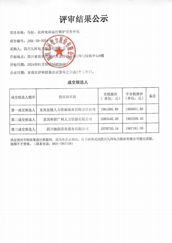 马拉、长河电站运行维护劳务外包评审结果公示