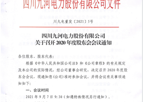 四川九河电力股份有限公司关于召开2020年度股东会会议通知各位股东、股东代表:根据《中华人民共和国公司法》和《公司章程》的有关规定及本公司的实际情况,经公司董事会研究,决定召开2020年度股东会会议,现通知您公司准时参加会议,并将会议有关事项通知如下:一、会议时间2021年9月7日9:30(如遇特殊情况另行通知)。二、会议地点四川九河电力股份有限公司十楼1012会议室(四川省宜宾市翠屏区南岸金沙江...